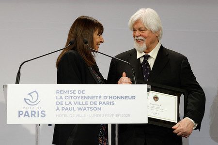 Париж, 3 февраля (Jiji Press) -- Мэр Парижа Анн Идальго вручила 3 февраля звание почетного гражданина города известному экологическому активисту Полу Уотсону, который находится в международном розыске за акции против японского научного китобойного промысла.