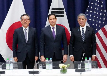 Министр иностранных дел Японии Ивая Такэси, госсекретарь США Марко Рубио и министр иностранных дел Южной Кореи Чо Дэ Юль выступили с заявлением после встречи в кулуарах Мюнхенской конференции по безопасности.