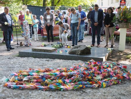 Во время церемонии к кенотафу были возложены тысячи бумажных журавликов, изготовленных местными жителями, а участники возложили цветы и почтили минутой молчания память жертв.