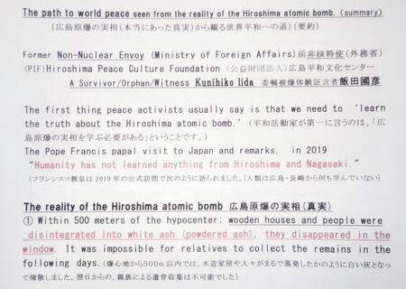 «Интересно, много ли людей действительно знают правду об атомной бомбе в Хиросиме? Не зная правды, нельзя понять необходимость ядерного разоружения». В своих выступлениях он рассказывает не только о личном опыте, но и о трагедии в эпицентре и его окрестностях. Температура земли в эпицентре достигала 3000-4000 градусов, в окрестностях «десятки тысяч людей превратились в белый пепел и были разнесены взрывной волной. Собрать останки было невозможно». Он также рассказывает о телах с содранной кожей, которые заполнили мосты и реки, о многочисленных сиротах, умерших от голода, и призывает: «Никогда больше нельзя допустить появления таких бесчеловечных и трагических жертв атомной бомбардировки».