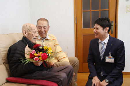 Мидзуно Киётака (крайний слева), самый пожилой мужчина, которому исполнилось 111 лет, получает букет цветов — 14 марта, город Ивата, префектура Сидзуока (предоставлено администрацией города)