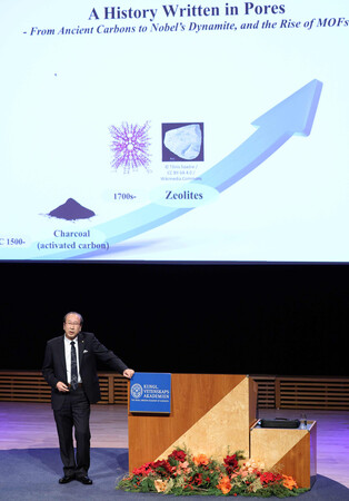В лекции под названием «Польза бесполезного: как МОК изменили концепцию пористых материалов», отражающем его жизненный девиз, он сначала представил обзор истории пористых материалов, имеющих бесчисленное множество микроскопических пор. Китагава отметил, что в изобретённом Альфредом Нобелем динамите использовались природные пористые материалы.