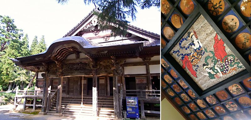 Храм Тюрэндзи (слева) и одна из потолочных росписей (справа)
