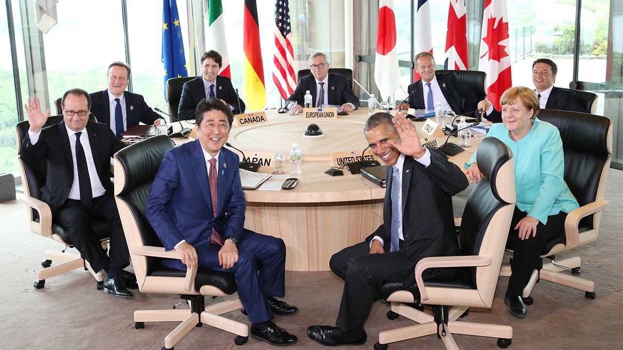 Фотография к заголовку: премьер-министр Абэ Синдзо (слева на первом плане), президент США Барак Обама (справа) и другие главы государств на саммите G7 в Исэ-Симе 26 мая 2016 г. в Исэ, префектура Миэ (© Jiji Press)
