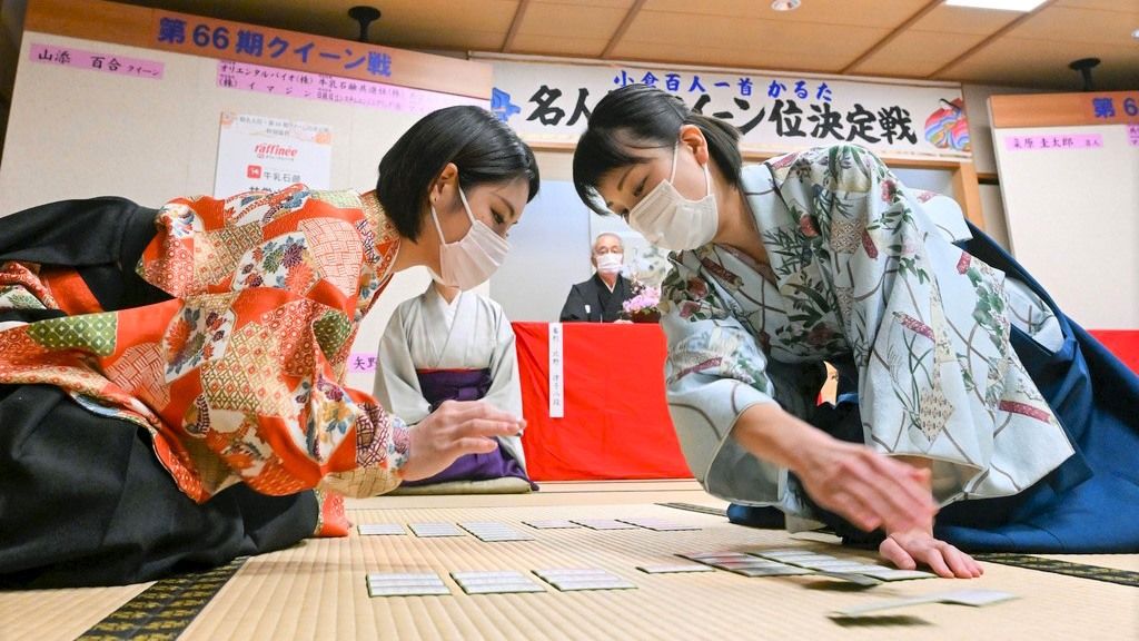 Фотография к заголовку: Действия финала конкурса Ogura Hyakunin isshu Competitive Karuta Queen 2023, который проходил в святилище Оми-дзингу в городе Оцу, префектура Сига (январь 2022 г., © Кёдо цусин)