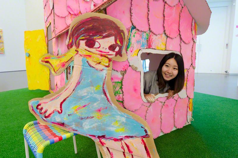 Босоногая девочка с огромными, полными любопытства глазами и с длинными, придающими её образу особую выразительность, руками, забавно кривит ротик, путешествуя по облаку на загадочной штуковине, похожей на космический корабль… цветы, животные, монстры – это повторяющиеся мотивы в творчестве Роккаку Аяко. Среди экспонатов выставки "по-детски" наивные рисунки, домики из картона, скульптурный ансамбль – гигантская глиняная девочка в сопровождении зайцев-призраков. А также демонстрация снятой художницей анимационной ленты под названием about us.
