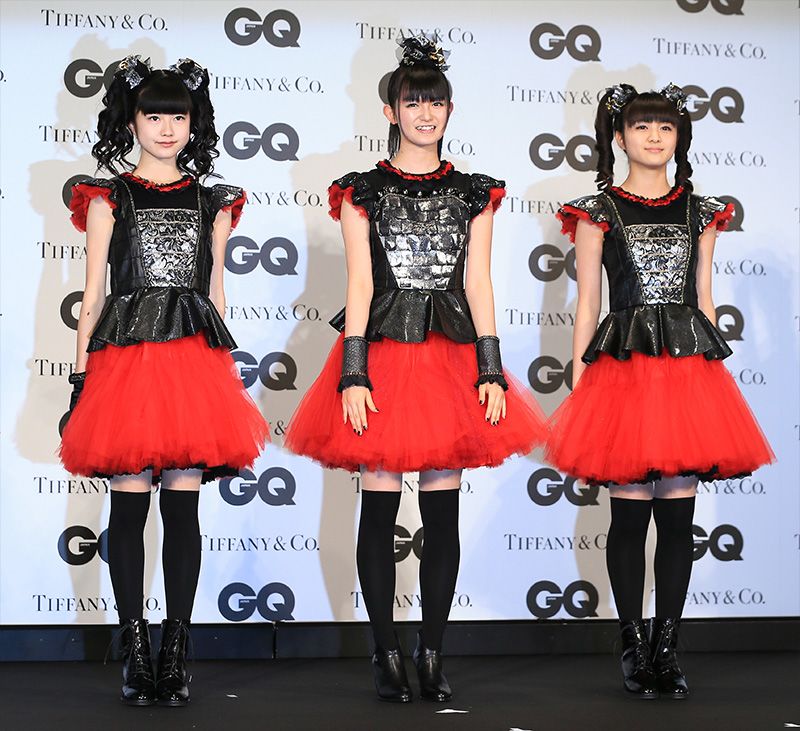 Babymetal позируют после получения специального приза журнала GQ «Люди года 2015» на церемонии, проходившей в Токио 19 ноября 2015 года. Слева направо: Юиметал, Су-Метал, Моаметал (© Jiji)
