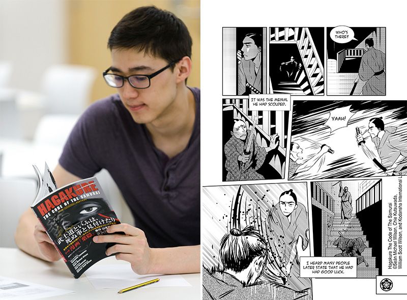 Участник семинара, читающий книгу Куцувады «Хагакурэ: Кодекс самурая», основанную на классической работе Ямамото Цунэтомо (адаптированный текст Шона Майкла Уилсона; опубликовано издательством Kodansha, USA)