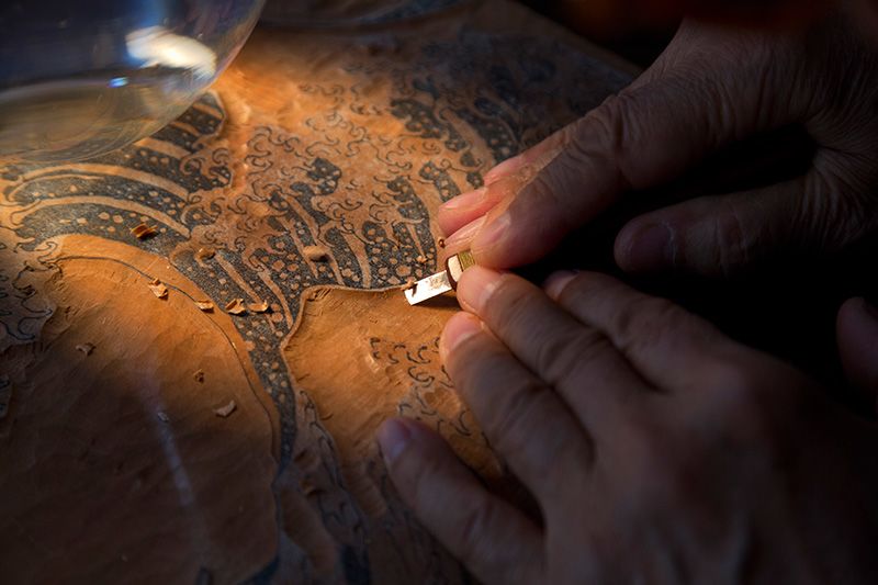 Работа резчика требует высочайшей точности, а потому рабочее место должно быть хорошо освещено. Под лампой, расположенной над доской, находится сосуд с водой. Свет от лампы, рассеиваясь в воде, равномерно освещает рабочую поверхность с разных сторон, и хорошо видны даже мелкие линии эскиза.
