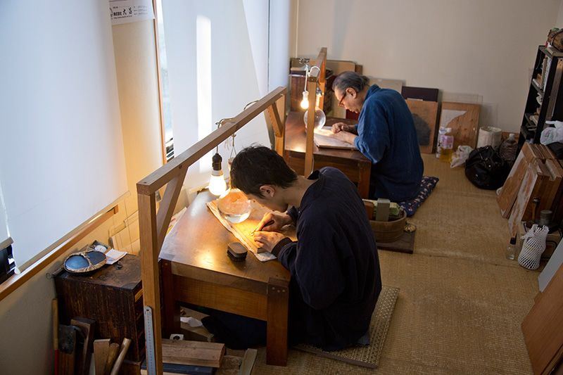 В мастерской царит атмосфера полного сосредоточения. Под рукой 69-летнего мастера Нииноми Моритики, который занимается гравюрой уже 50 лет, набор различных ножей и стамесок.