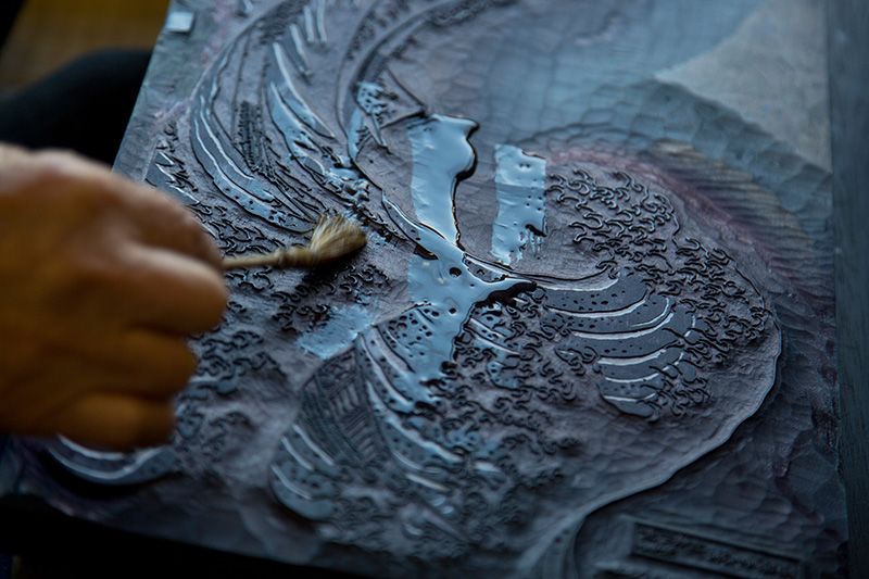 Создание досок для печати «Большой волны в Канагаве» занимает около трёх недель. Кропотливая и тонкая работа над гравюрой, требующая от резчика высочайшей точности и умения, поразительна.