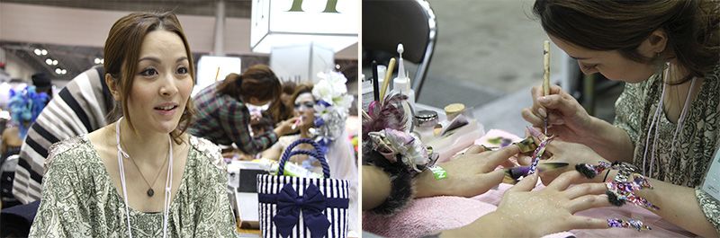 (слева) Каждый год в ноябре Ассоциация нейлистов Японии проводит выставку "Нейл ЭКСПО", которая всегда проходит в рамках "месяца нейл-дизайна". На семнадцатой по счёту выставке достижений в области нейл-дизайна, которая прошла в 2012 году в комплексе Токио Биг Сайт, за два дня побывало около 54 тысяч посетителей. (справа) Одним из главных мероприятий выставки 2012 года стал конкурс "нейтифул контест", название которого представляет собой комбинацию из двух английских слов: "нейл" и "бьютифул" (что в приблизительном переводе означает: "великолепные ногти"). Однако участницы получали оценку не только за ногти, но и за причёску, макияж и костюм – судьи оценивали созданный образ в его совокупности. (Фото предоставлено Ассоциацией нейлистов Японии).