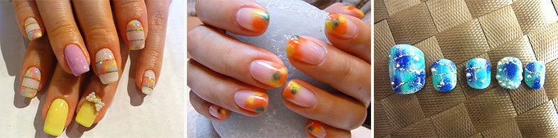 Гелевые ногти c ярким, красочным дизайном (слева: нейл-салон "nadine", в центре: нейл-салон "hokuri"). Сезонный нейл-арт для пальцев ног (справа: нейл-салон "Tout-soleil")