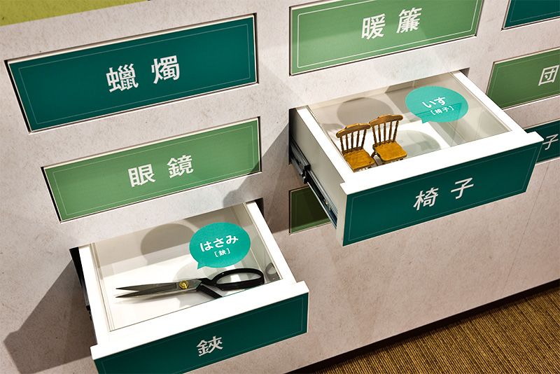 Посетители могут попробовать прочитать кандзи, обозначающие предметы домашнего обихода, а затем открыть ящик, чтобы проверить правильность своего предположения.