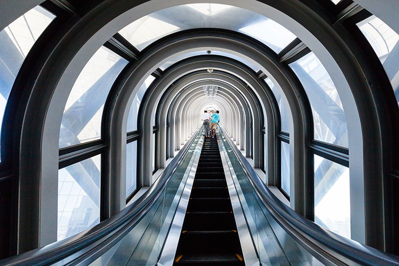 Два эскалатора, как будто висящие в воздухе, тянутся к круглому проёму посередине «Сада в небе»