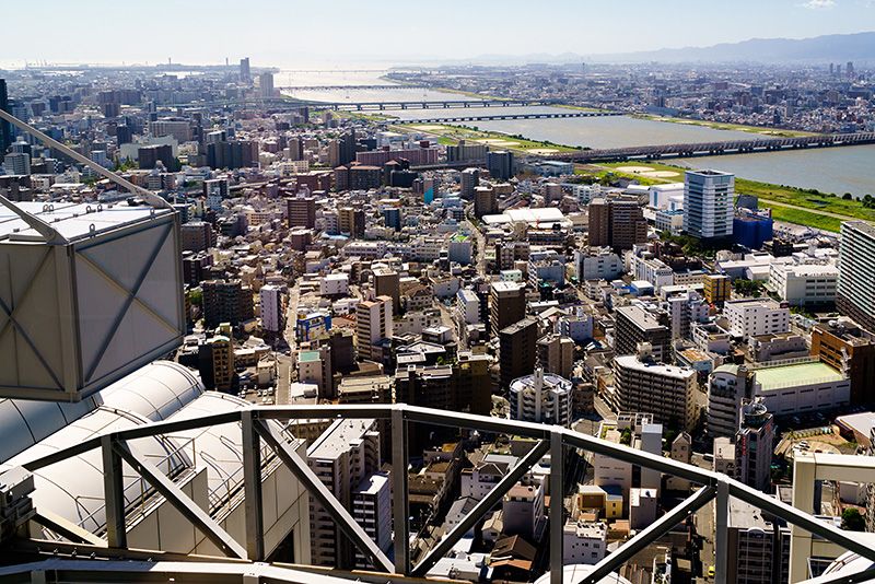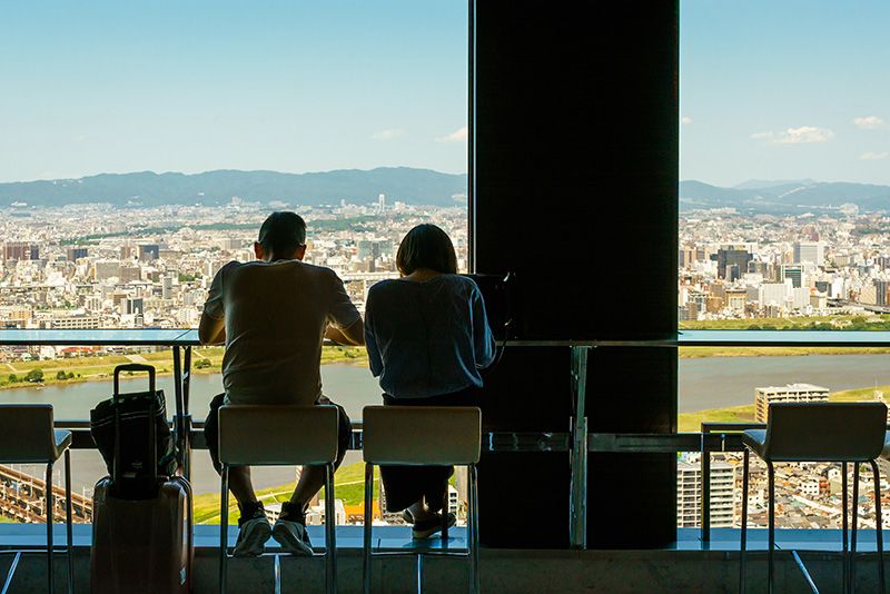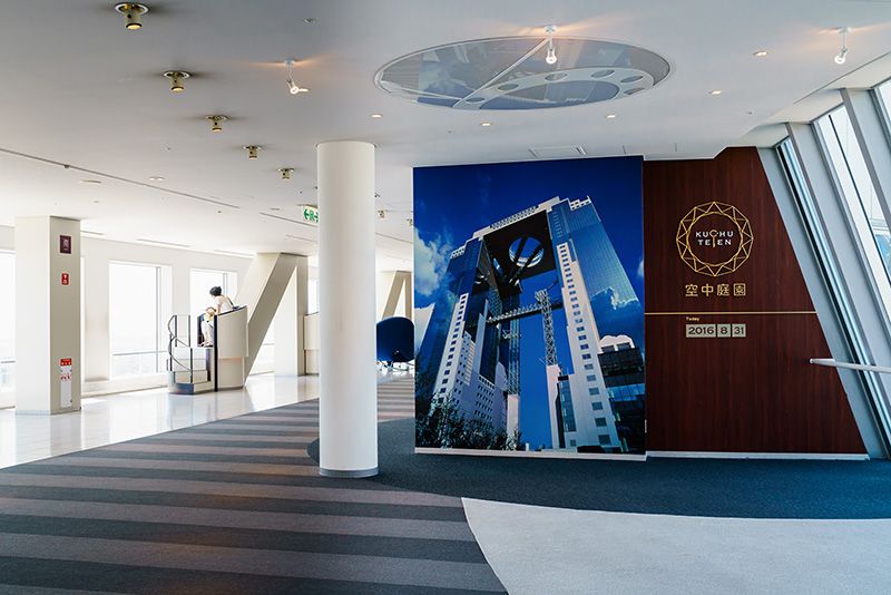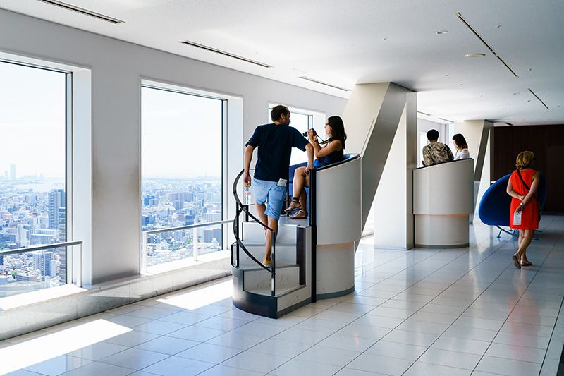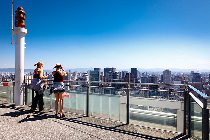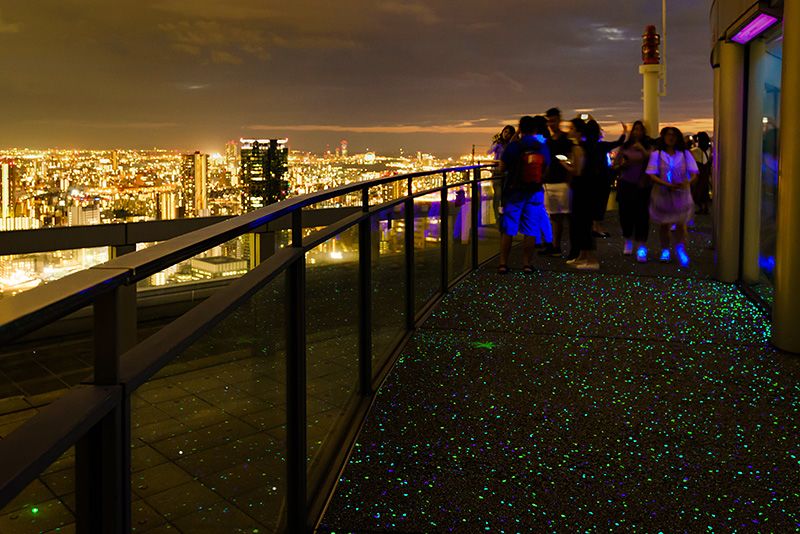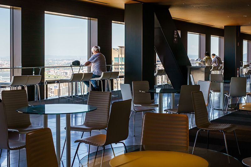 На закрытой площадке установлено множество столов, где посетители могут спокойно отдохнуть, любуясь видами Осаки