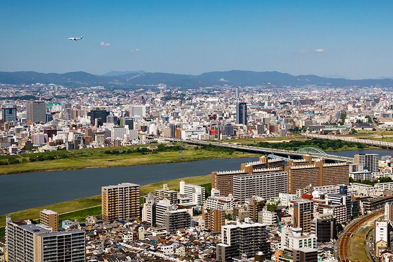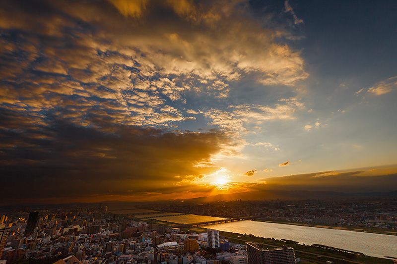 На западе величественно несёт свои воды река Ёдогава и высятся горы Рокко. В хорошую погоду можно увидеть даже огромный мост над проливом Акаси