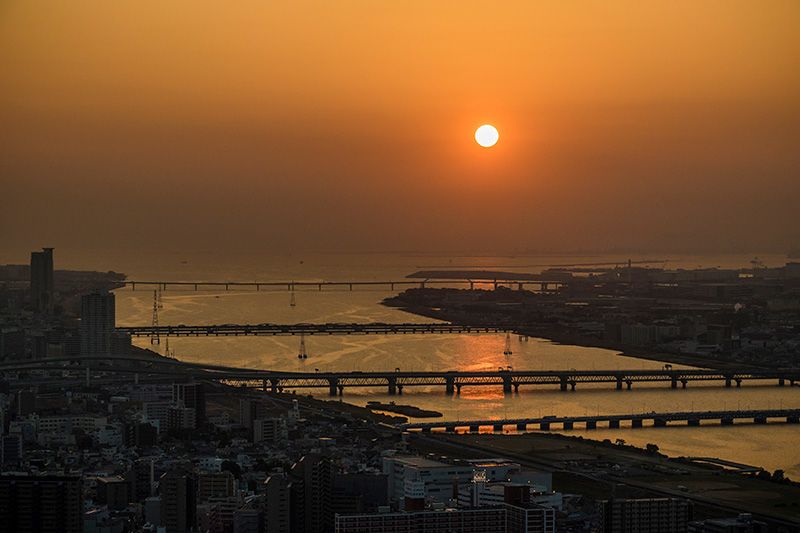 В феврале и октябре можно видеть, как солнце садится в районе огромного моста через пролив Акаси