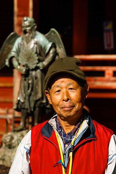 Сакамото Тамэаки, гид-волонтёр, перед статуей тэнгу в монастыре Якуоин на горе Такао