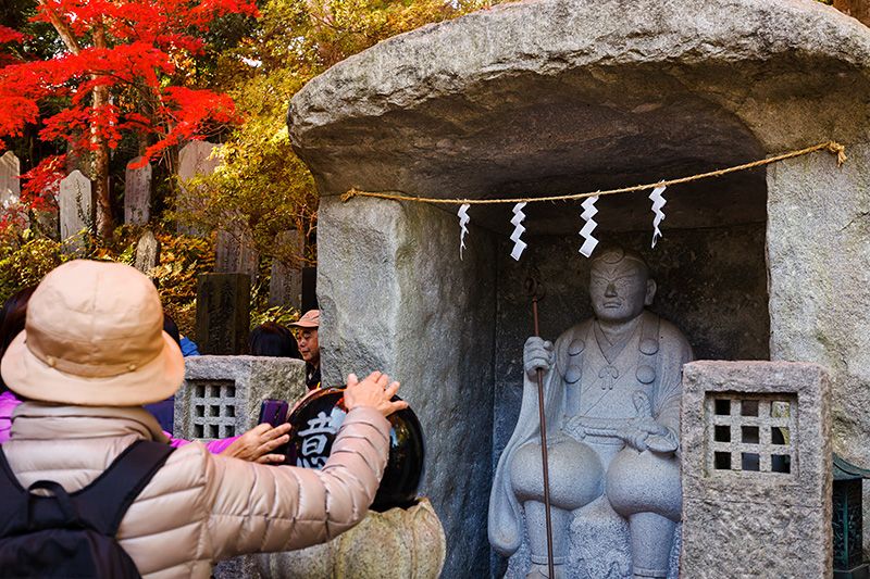Вдоль дороги к храму тут и там видны фигурки сидящих бодхисаттв Дзидзо. Всего их 88, и говорят, что если всех найти и поклониться каждому из них, можно обрести такую же заслугу, как от паломничества по 88 храмам Сикоку
