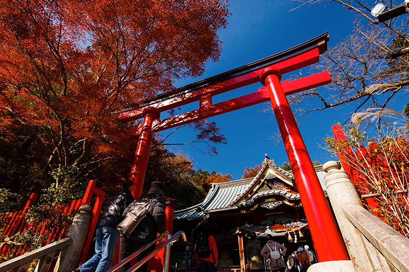 Перед входом в главное здание монастыря, павильон Идзунагонгэндо, находятся ворота-тории, как в синтоистских святилищах. Это известное место любования осенней листвой