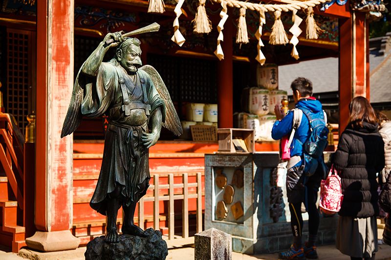 Небольшая фигурка тэнгу перед главнымхрамом. Гора Такао связана с культом сюгэндо, в котором сама природа является воплощением будды, и возможно, что последователей культа, монахов-ямабуси, принимали за мифических существ тэнгу, когда они ходили по горе, откуда и появились легенды о тэнгу Такао