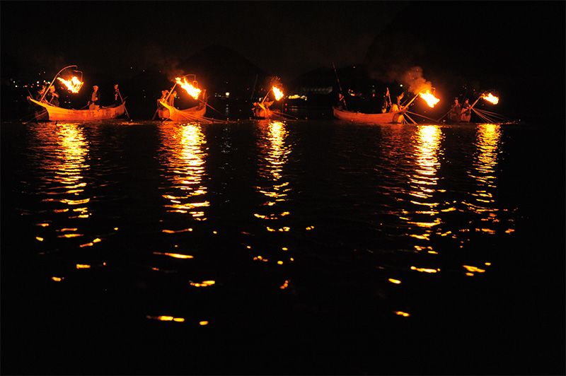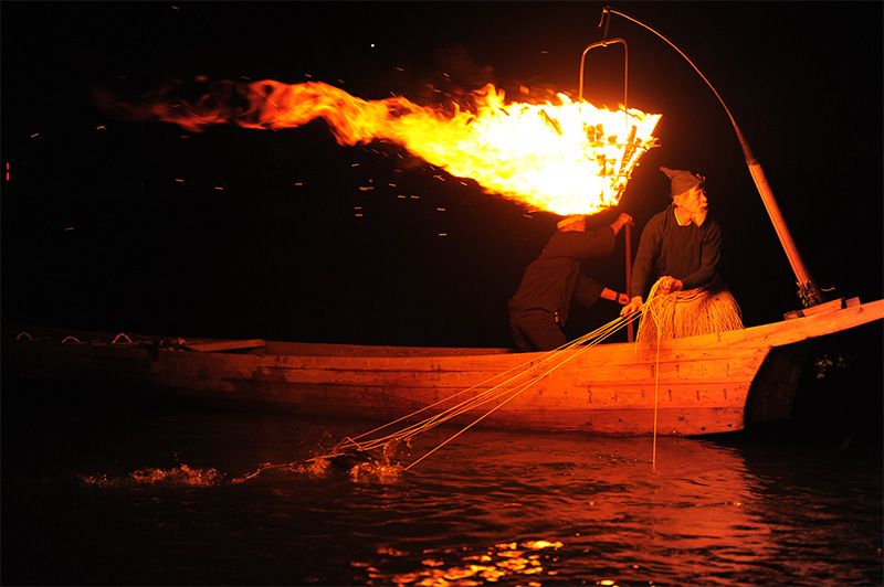 Укаи – это традиционный способ рыбной ловли, при котором ручных бакланов, у которых шея перевязана шнурком так, чтобы горло не пропускало крупную рыбу, выпускают в реку, чтобы они ловили форель. Когда притаившаяся под камнями на речном дне рыба видит свет факела, установленного на носу лодки, она пугается и покидает убежище, а бакланы её ловят, после чего форель, которую баклан не может проглотить из-за шнурка на шее, извлекается из клюва.