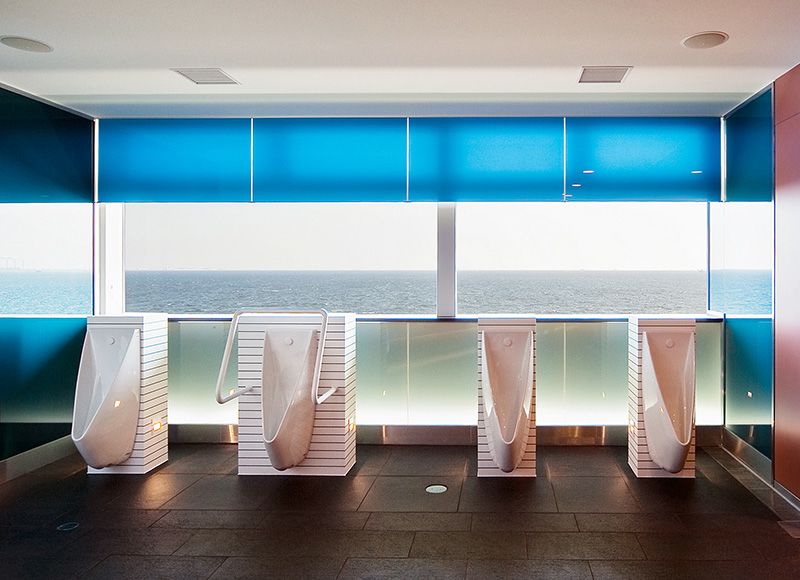 В проекте туалета зоны отдыха «Умихотару» на автотрассе «Токио Акуарайн», проходящей над Токийским заливом, в полной мере использованы особенности расположения.