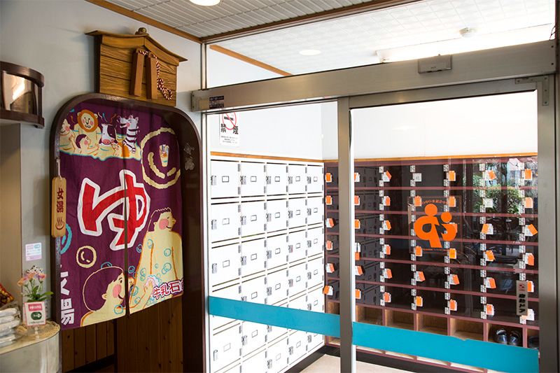 Когда мы проходим за занавеску-норэн, в прихожей (гэнкан) мы видим шкафы для обуви. Если деревянная плашка-ключ торчит в замке – ячейка свободна. Ставим внутрь обувь, закрываем и вынимаем плашку – ячейка закрыта. В «Такараю» плашку-ключ вы сохраняете до ухода, а в некоторых сэнто ключ сдают на хранение на приёмной стойке.