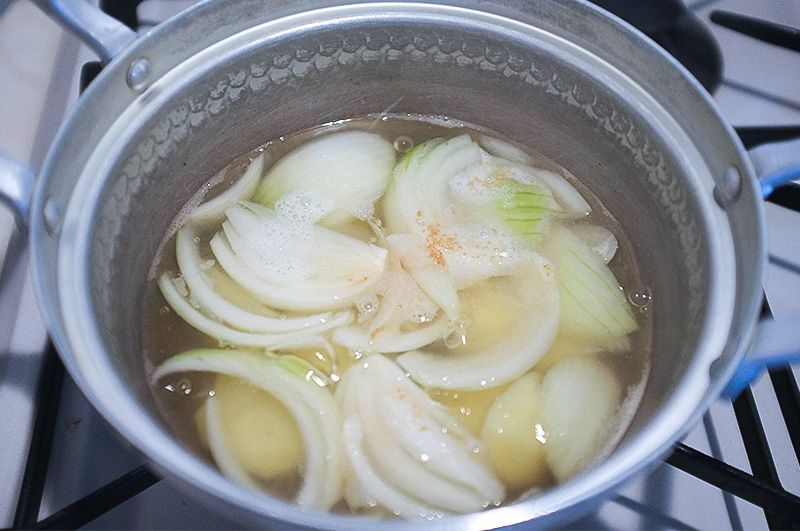- Очищенные и нарезанные лук и картофель варим в воде на слабом огне, пока они не размягчатся.