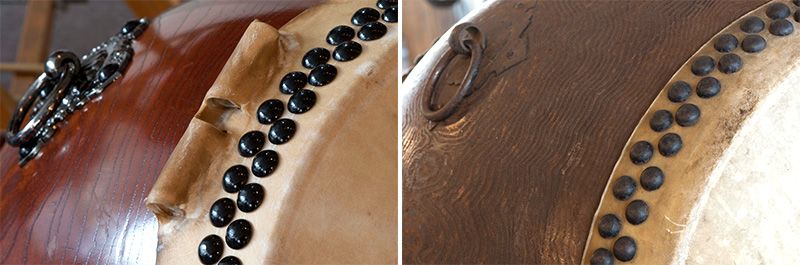 Нагадо-дайко (Япония). Кожа отличается, идет ли речь, чтобы играть музыку или для церемонии. Для выступлений (на фото слева), края сохраняются для того, чтобы подтянуть кожу, когда она стала слишком свободной. Для церемоний, в святилищах и храмах (фото справа), «уши» отрезаются, чтобы сделать ее более красивой.