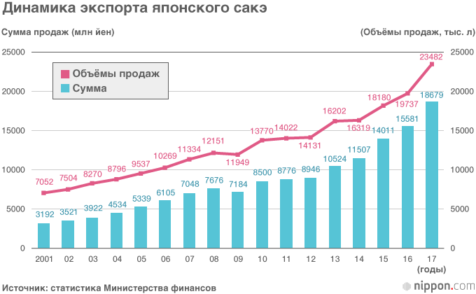 В последние десять лет в производстве сакэ наблюдается необычайное оживление. Оно стало привлекать к себе внимание вместе с ростом мировой популярности японской кухни, объёмы его экспортных продаж и выручка от них растут. За 16 лет, прошедших с 2006 года, объёмы увеличились в 1,9 раза, а сумма продаж – в 2,5 раза. Каждый год регистрируется новый рекорд экспорта сакэ, и производителям удалось добиться большого прогресса в продаже этого напитка за пределами Японии.