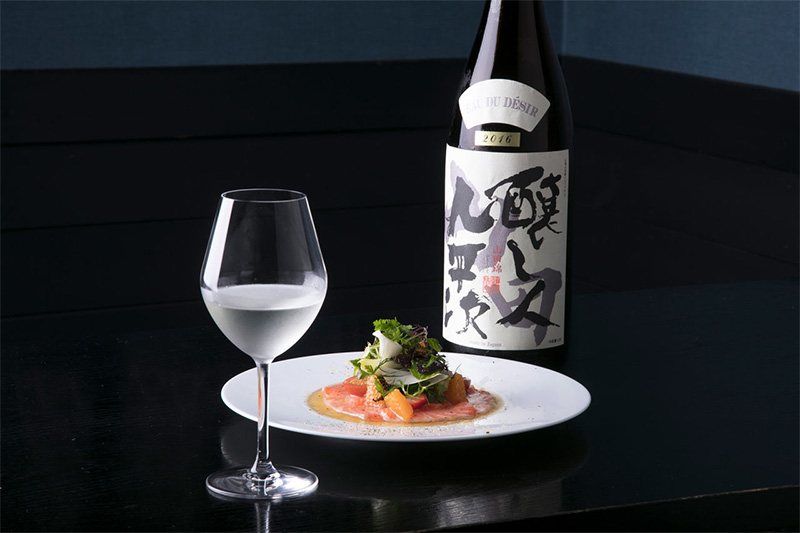 Сакэ дзюммай-дайгиндзё-сю EAU DU DESIR (фр. «Вода желания») из риса ямада-нисики завода «Камосибито кухэйдзи» хорошо сочетается с холодными блюдами, обладающими выраженным ароматом – на фотографии маринованный лосось с цитрусом дэкопон, клубникой, томатами, молодыми листьями салата (бистро MiwaMiya в Асагая, Токио)