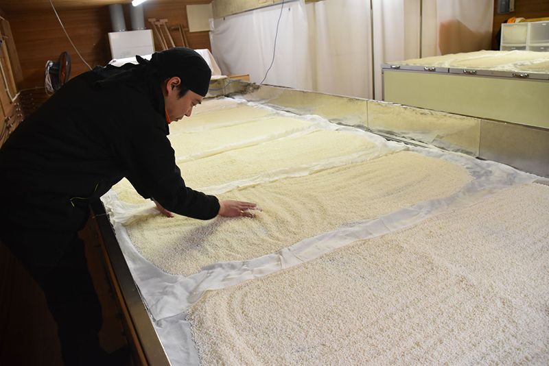 Усуи Кадзуки, сакэвар в 11-м поколении, проверяет на ощупь рис для закваски кодзи
