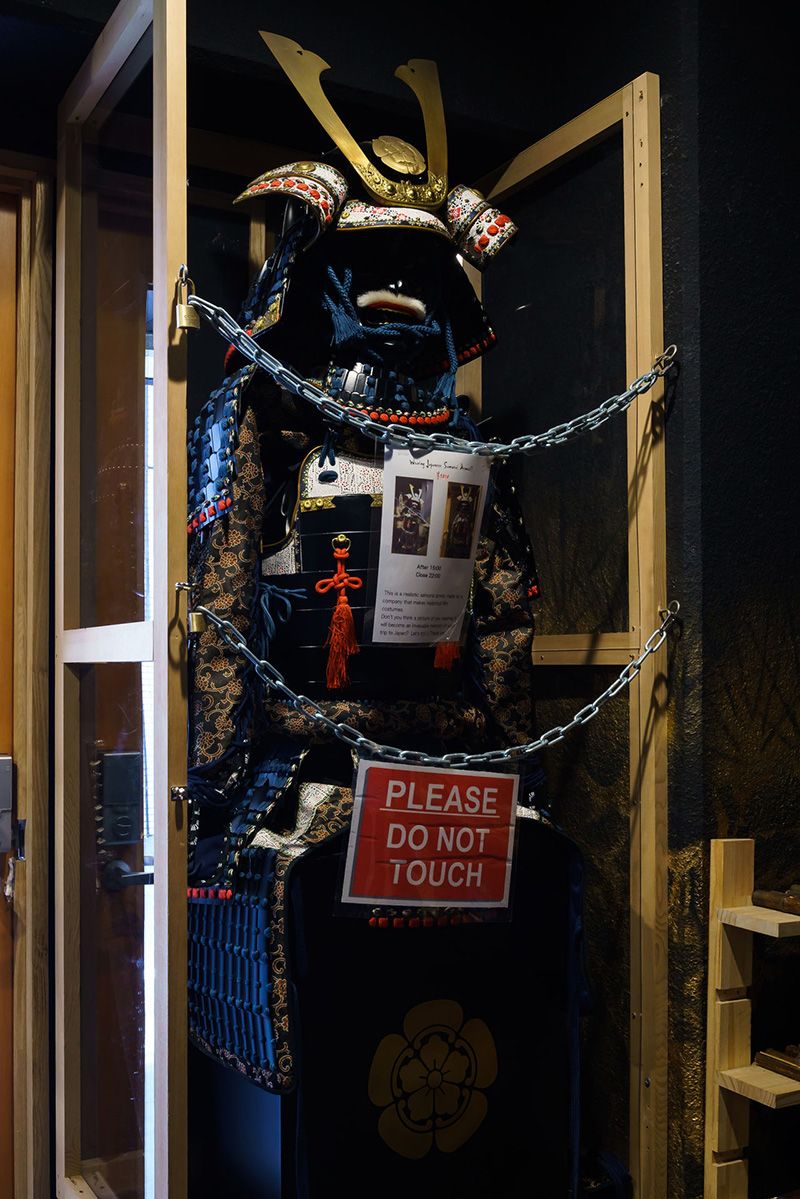 Вход украшают самурайские доспехи, которые вполне мог бы носить какой-нибудь военачальник или полководец. Комплект весом 15 кг был тщательно воссоздан умелыми мастерами компании «Марутакэ Сангё» префектуре Кагосима. Чтобы почувствовать себя настоящим военачальником периода Сражающихся провинций (1467-1568), доспехи можно надеть и сделать фото на память.
