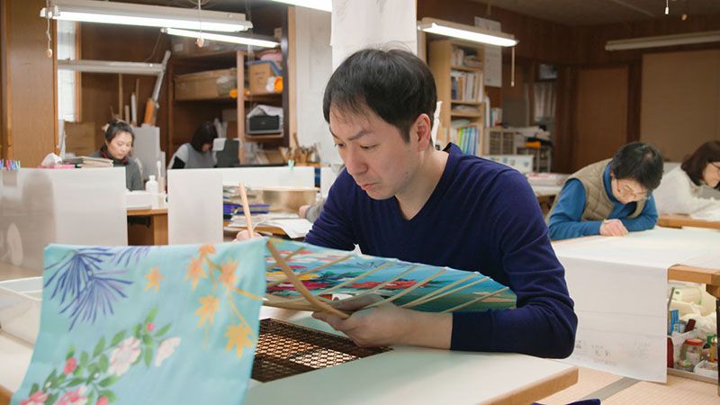 Майда Хитоси сосредоточенно раскрашивает ткань
